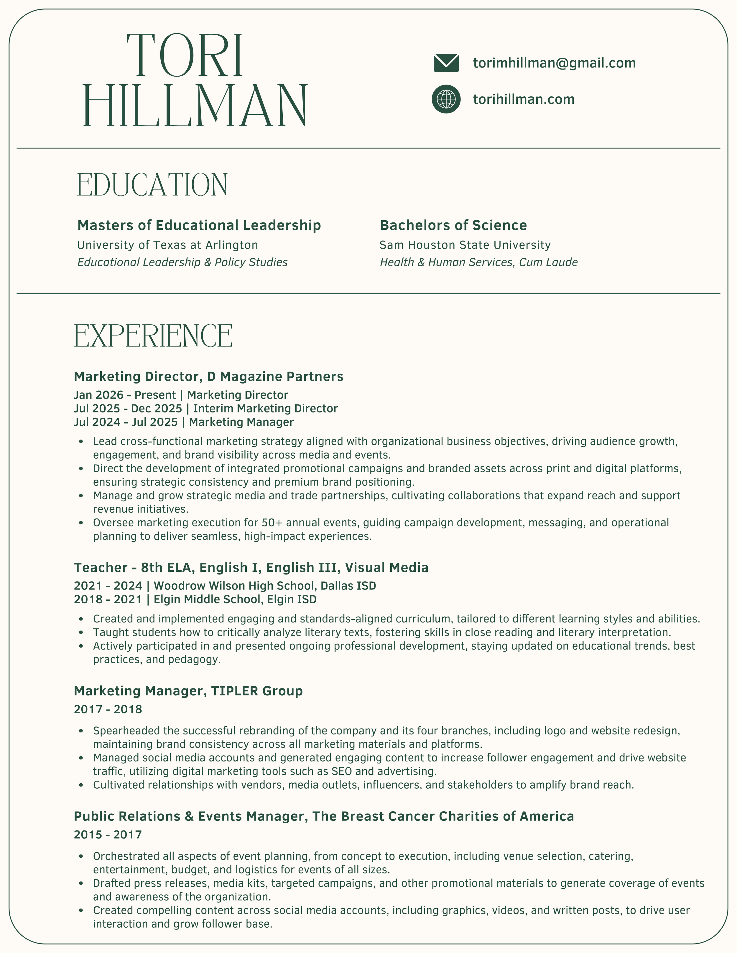 After growing into a marketing management role and now serving as Marketing Director at D Magazine, I lead revenue-driven strategy across media and events for all four publications. I collaborate cross-functionally to launch initiatives, elevate brand presence, and create campaigns that resonate with sophisticated audiences while delivering measurable results.